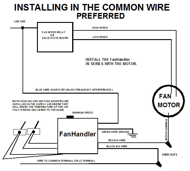 Only the #14 black wire (line in) and the #14 red wire (line out to motor) operate the motor. The blue wire is used to eliminate radio frequency noise, and the green wire is for ground. These controls can be installed in the hot (L1) or the common line (or L2). FanHandler controls can be used on any speed tap or switched between speed taps. They can be switched on and off or run continuously. The low voltage #18 wires located next to the ETL label are connected to the sensors and can be extended by using low voltage thermostat wire.