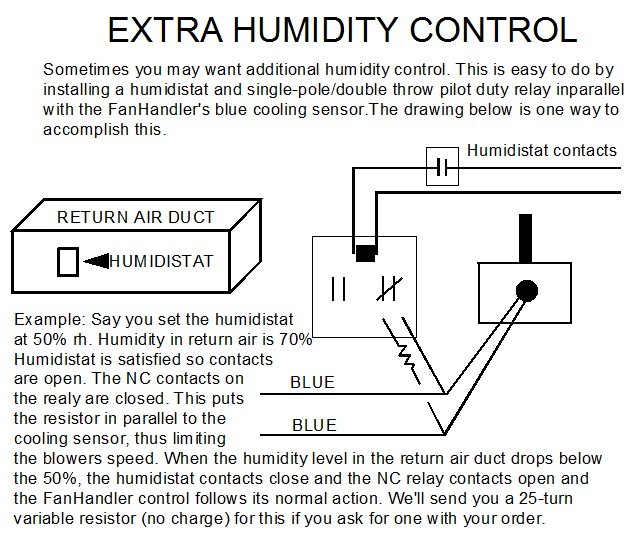 - Verify operation. Allow the system to balance out so it is delivering about 72° and is neither calling for heating nor cooling. Then set the thermostat to call for heat, as the temperature rises in the duct, the fan speed should increase. Set the thermostat to shut the heat off and observe that as the delivered air temperature drops, the fan speed will decrease to your PRE-SET minimum speed. Then set the thermostat to call for cooling, as the temperature in the duct drops the fan speed will increase and hit top speed at about 50° delivered temperature. Turn thermostat up turning off the air conditioner. Observe that while the temperature in the duct approaches room temperature, the FanHandler control will smoothly decrease the fan speed back to your minimum speed setting.