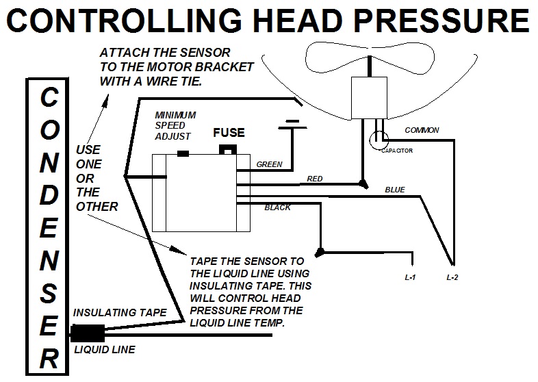 FanHandler LA models are used to control refrigerant head pressure. They are basically wired the same as the other models. The only difference is that the sensor is located in the air stream leaving the condenser coil or attached to the liquid line (recommended best) just as it leaves the condenser. Use insulated black tape which works very well. Protect the control box from the weather by installing it in the control compartment or using a weather-tight box. Set the minimum speed so that the condenser fan is able to turn when power is applied to motor. LA controls are aoften used to control the speed of the circulating pump for head pressure control in water source heat pump applications. This is also a very useful tool to use when setting refrigerant charge in cold weather. It beats “tenting” by a long shot.